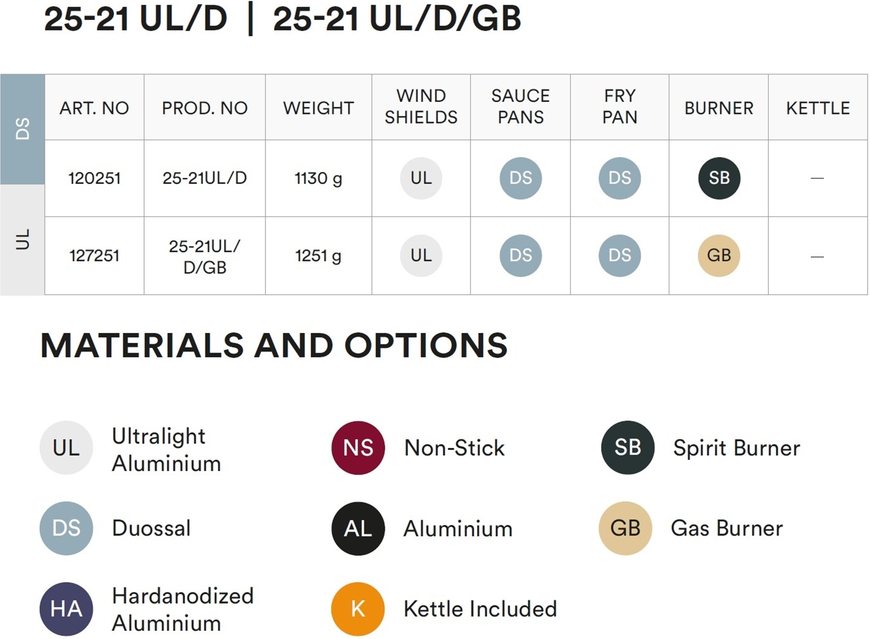 Ülikergest alumiiniumist Trangia 25-3 UL matkapliitide komplekt alkoholipõletiga. Kütusena kasutatakse denatureeritud alkoholi. Komplekti kuulub kaks Duossali teraskattega potti (1,5 ja 1,75 l) ja Duossali teraskattega praepann (ø 22 cm), mis vajadusel toimib ka pottide kaanena. Tänu avaratele pottidele ja pannile sobib Trangia 25-3 UL hästi kasutamiseks kogu perele.