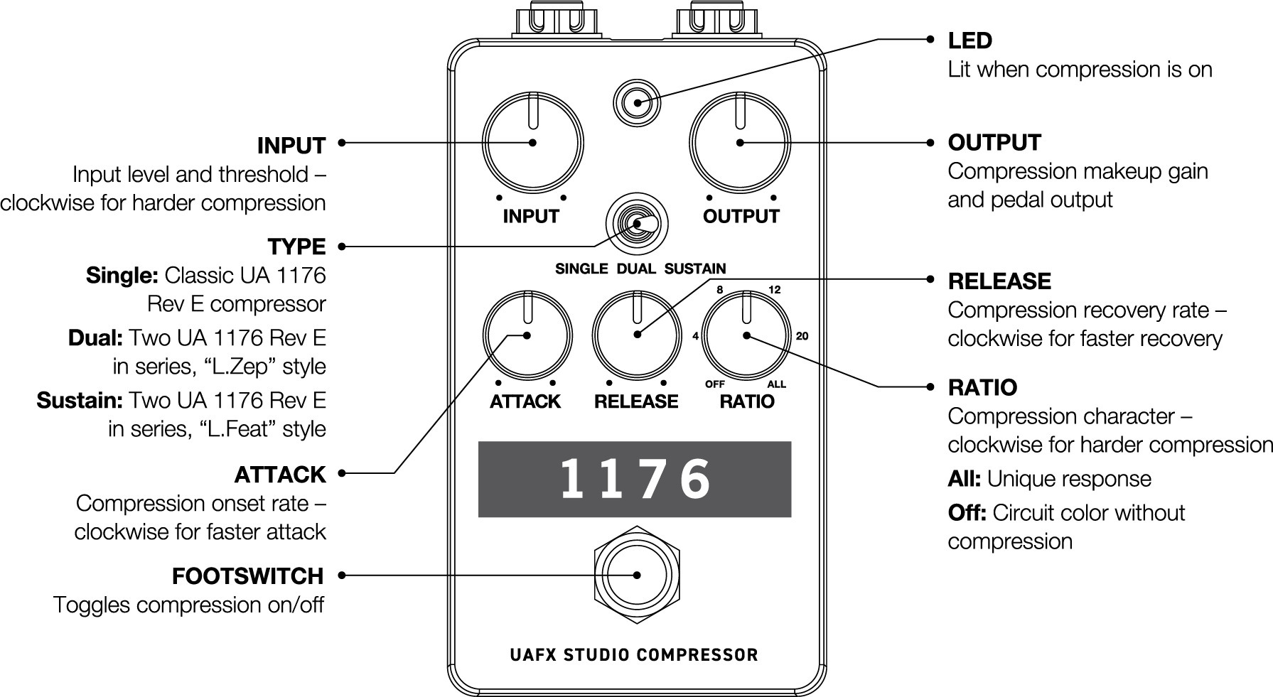 Universal Audio UAFX 1176 stuudiokompressori pedaalUniversal Audio UAFX 1176 stuudiokompressori pedaal