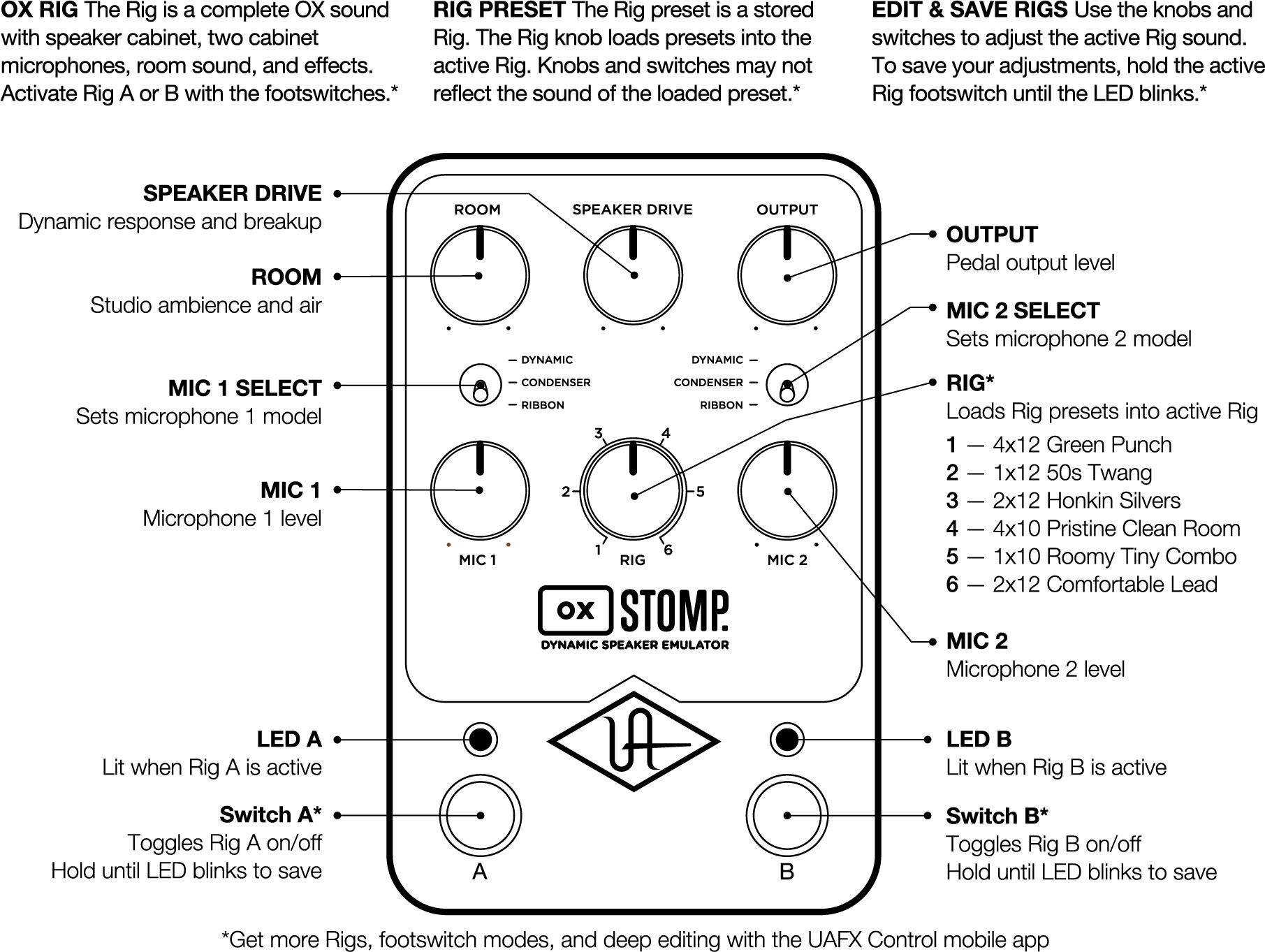 UAFX OX Stomp on stereopedaal dünaamilise kõlarimodelleerimise, autentsete kitarrikappide, mikrofonide ja stuudiokvaliteediga efektidega. Hoolikalt modelleeritud helisid saab UAFX Controli mobiilirakendusega põhjalikult kohandada.