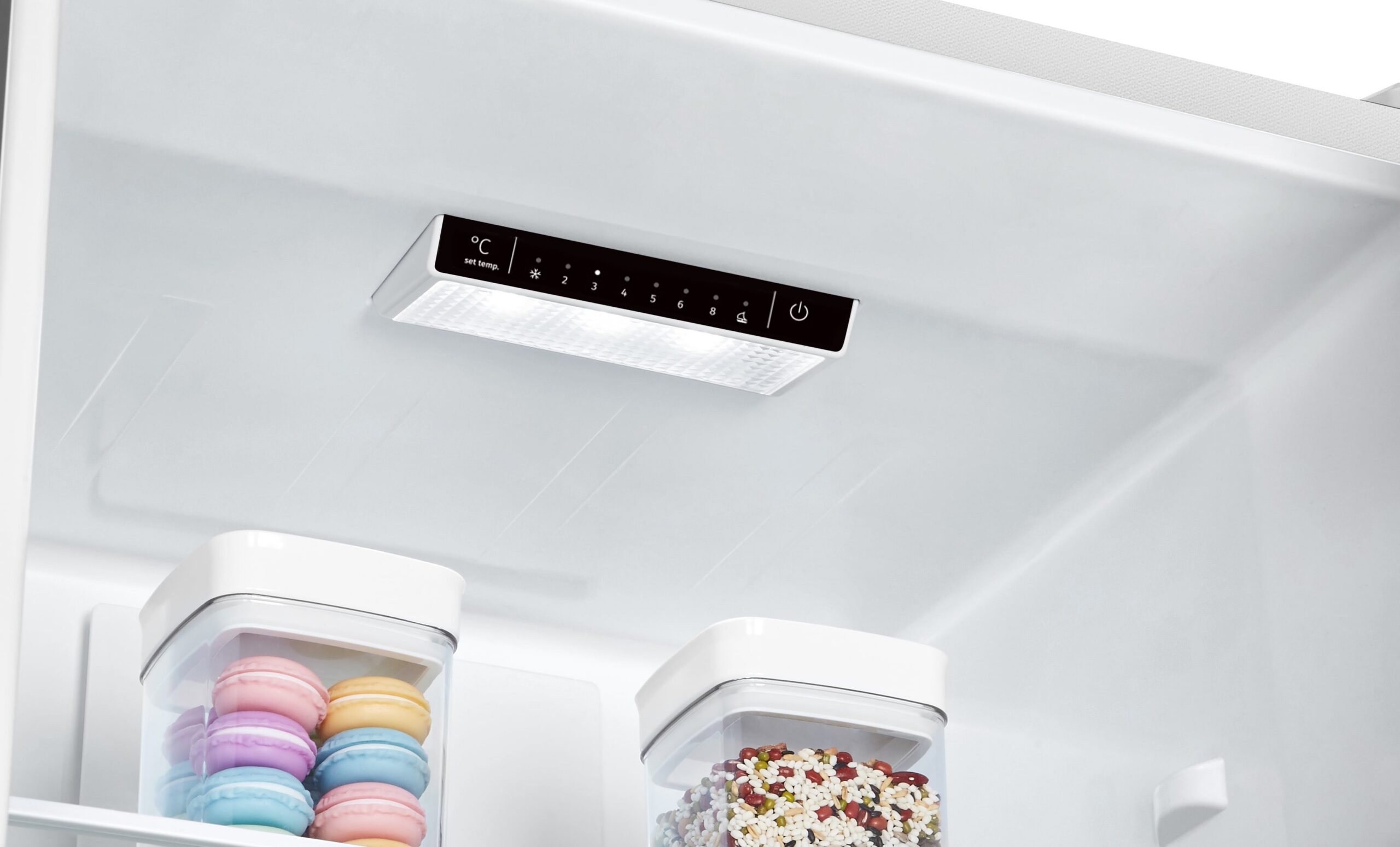 Oven takana olevan tyylikkään ja informatiivisen näytön kautta käytät kaikkia jääkaapin toimintoja näppärästi. Voit kontrolloida jääkaapin lämpötiloja, pikapakastusta tai vaikkapa laittaa lomien ajaksi energiaa säästävän lomatoiminnon päälle. Koska näyttö on kaapin sisässä, ulospäin oven pinta on tyylikkään rikkumaton ja sopii kaikkiin keittiöihin.