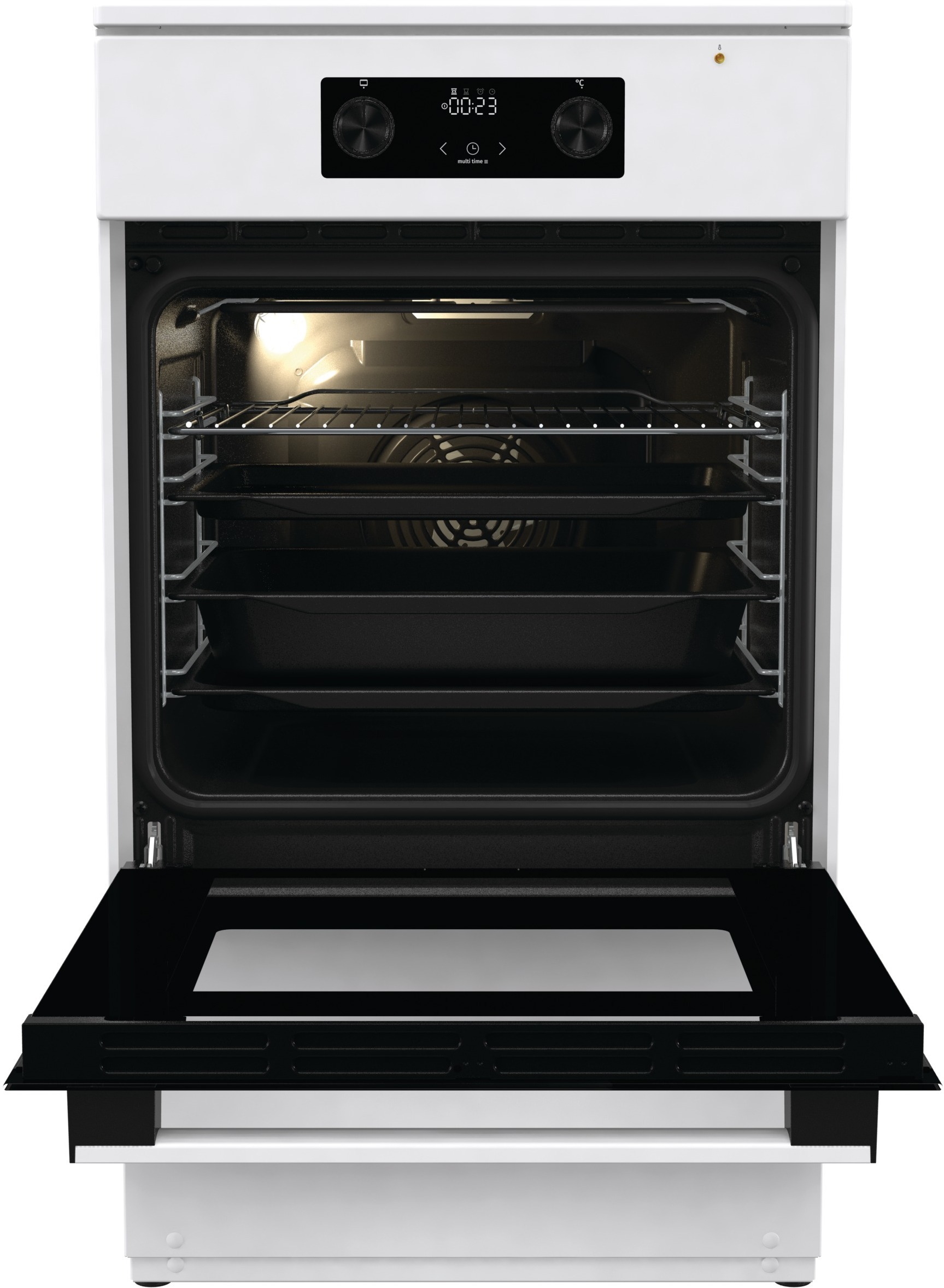 Näytön avulla voit valita lämpötilan aina 300⁰ saakka, ajastaa uunia, valita halutun paistamisen lopettamisajan ja tarkkailla koko ajan mitä uunissa tapahtuu. Voit käyttää näyttöä myös munakellona. Kun uuni ei ole käytössä, näytössä on digitaalinen kello.