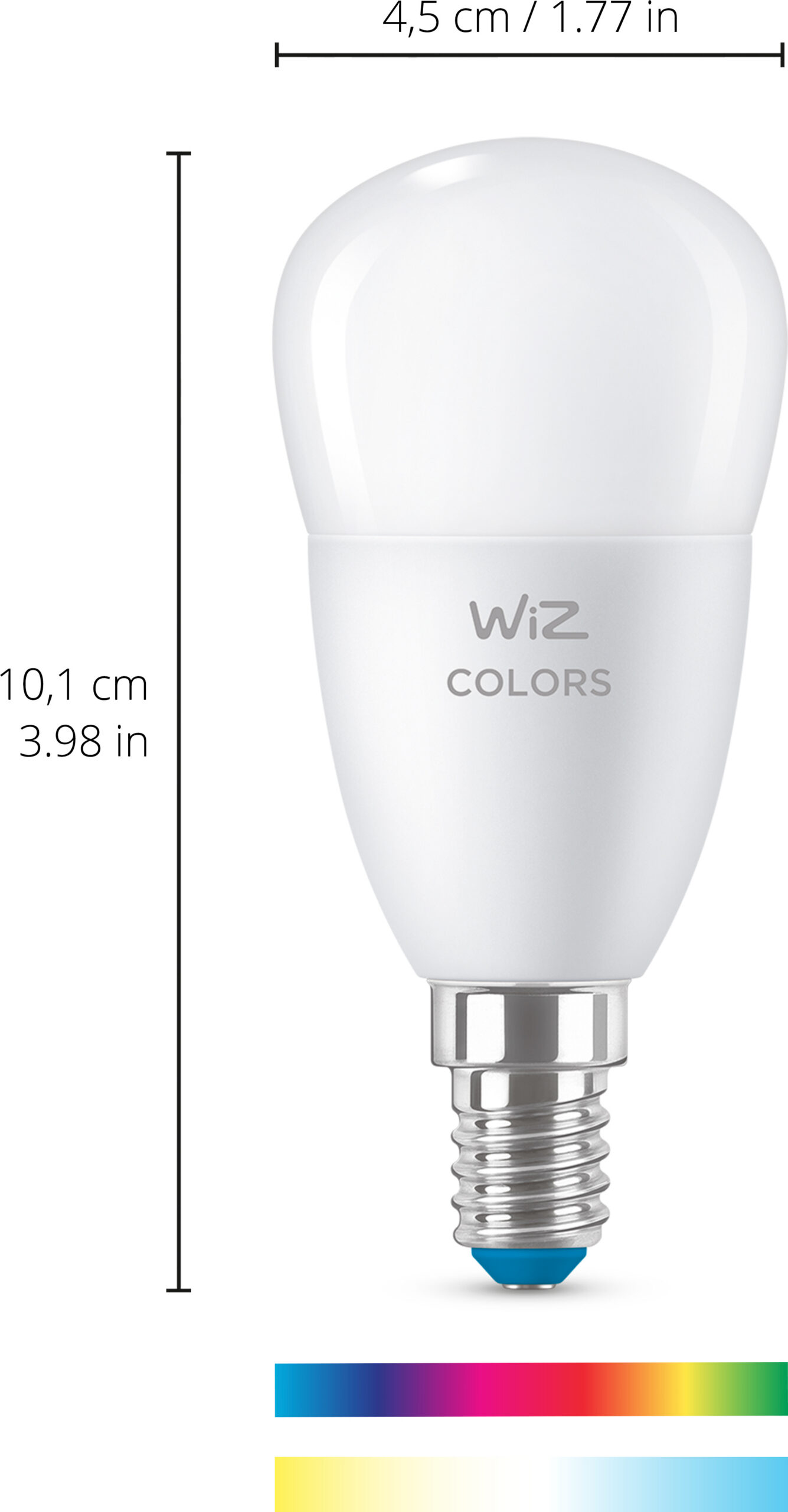 WiZ full color -älyvalojen ansiosta kotisi loistaa kauniin värikkäässä tunnelmavalaistuksessa. . Lamppu sopii E14-kantaisiin valaisimiin, joissa tarvitset hieman pyöreähköä lamppua, tämän lampun halkaisija on 45 mm