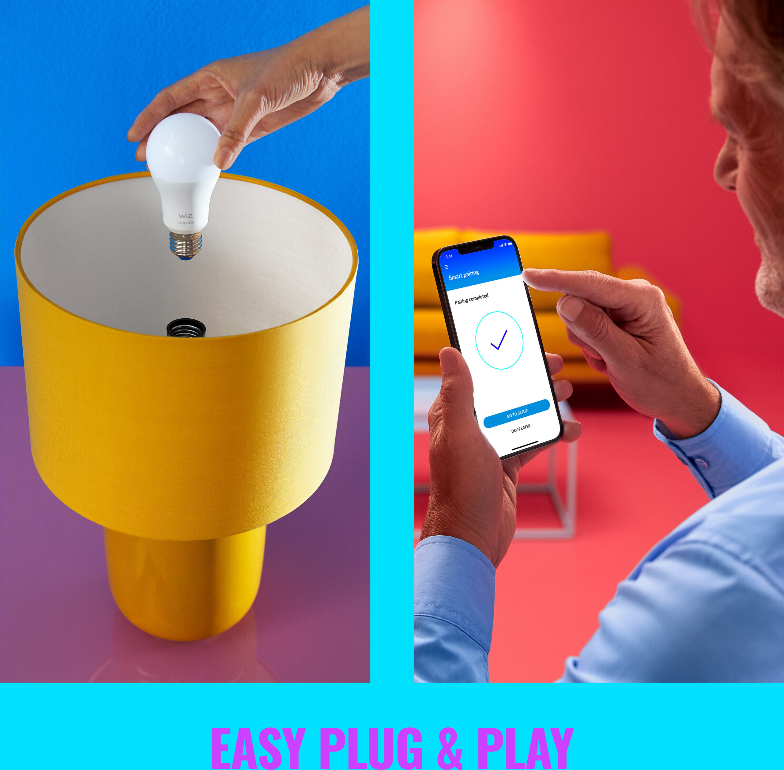 WiZ-lamput ovat helppo liittää olemassaolevaan WiFiin ja käyttäjäystävällinen sovellus on heti valmiina käyttöön esiasetettujen ohjelmien kautta. Voit säätää valon kirkkautta sovelluksella tai äänellä ja voit lisäksi hankkia kaukosäätimen tai liiketunnistimen jolla helpotat valojen käyttöä vieläkin enemmän. Voit itse luoda myös omat rutiinisi jolloin valot syttyvät ja sammuvat haluamallasi tavalla. WiZin innovatiiviset valaistusratkaisut tekevät sinun jokapäiväisestä elämästäsi helpompaa.