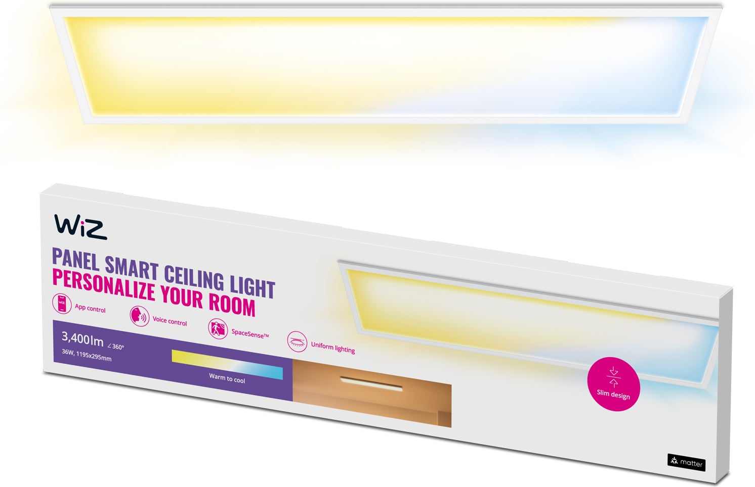 WiZin älykkäiden valaisinpaneelien avulla voit luoda päivänvaloa jäljittelevä valaistuksen kaikkialle kotiin, vaikka huoneessa ei olisi edes ikkunaa. Paneelivalaisin muistuttaa kattoikkunaa suorakulmion mallisen muotoilun ja valkoisen kehyksensä ansiosta. Valaisimen tyylikäs muotoilu sopii vaivattomasti kaikenlaisiin kodin sisustustyyleihin, ja valaistusta voidaan säätää monilla eri tavoin lämpimästä viileän valkoiseen valoon. Käytä harmaalla säällä päivänvalon kaltaisia viileitä valkoisen valon sävyjä virkistymiseen ja keskittymiseen. Kun haluat puolestaan rentoutua ja luoda täydellisen tunnelman elokuvailtaan, sulje verhot ja valitse lämpimän valkoinen valo. Nauti myös päivän mittaan muuttuvasta valosta, joka mukailee luonnon vuorokausirytmiä. WiZ-sovelluksen ansiosta älyvalaistuksen ohjaus on helppoa, ja sovellus tarjoaa monia mahtavia ominaisuuksia. Valaistusta voidaan ohjata myös helposti äänikomennoin älypuhelimella tai ääniavustajalla. Tee arjesta mukavampaa ja valoisampaa WiZin avulla. Joka tilanteeseen sopivan valaistuksen ohjaaminen ei ole koskaan ollut yhtä helppoa ja hauskaa.