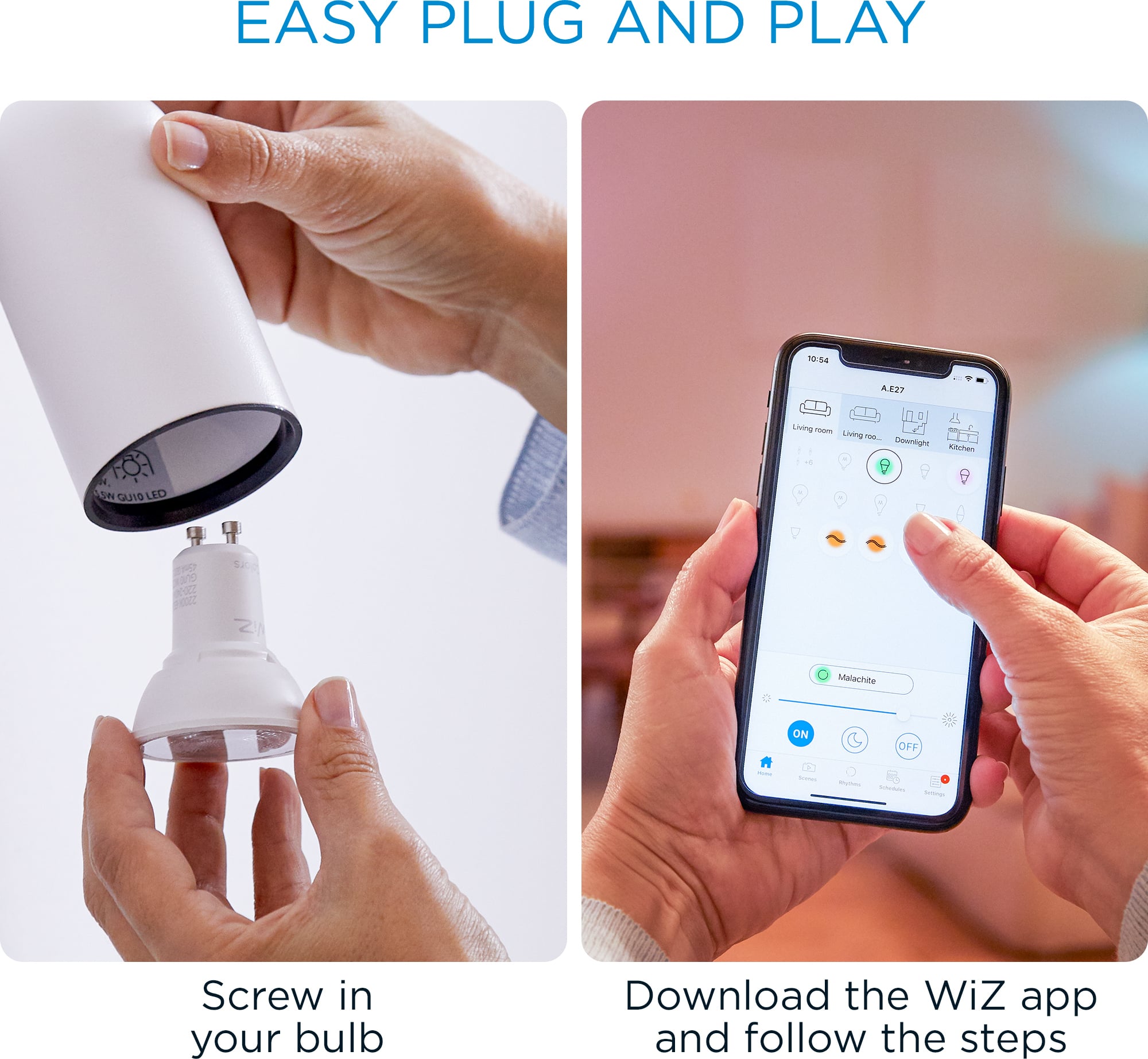 WiZ LED-pirniga saad tuua oma igapäevaellu täisvärvilised pirnid, mis toovad nutika valgustuse. See GU10-põhine prožektor on sama suur kui halogeenpirnid ja saad WiZ-pirni kasutada oma olemasolevas valgustuses. Loo oma atmosfäär 16 miljoni värvi või erinevate valge valguse varjunditega.