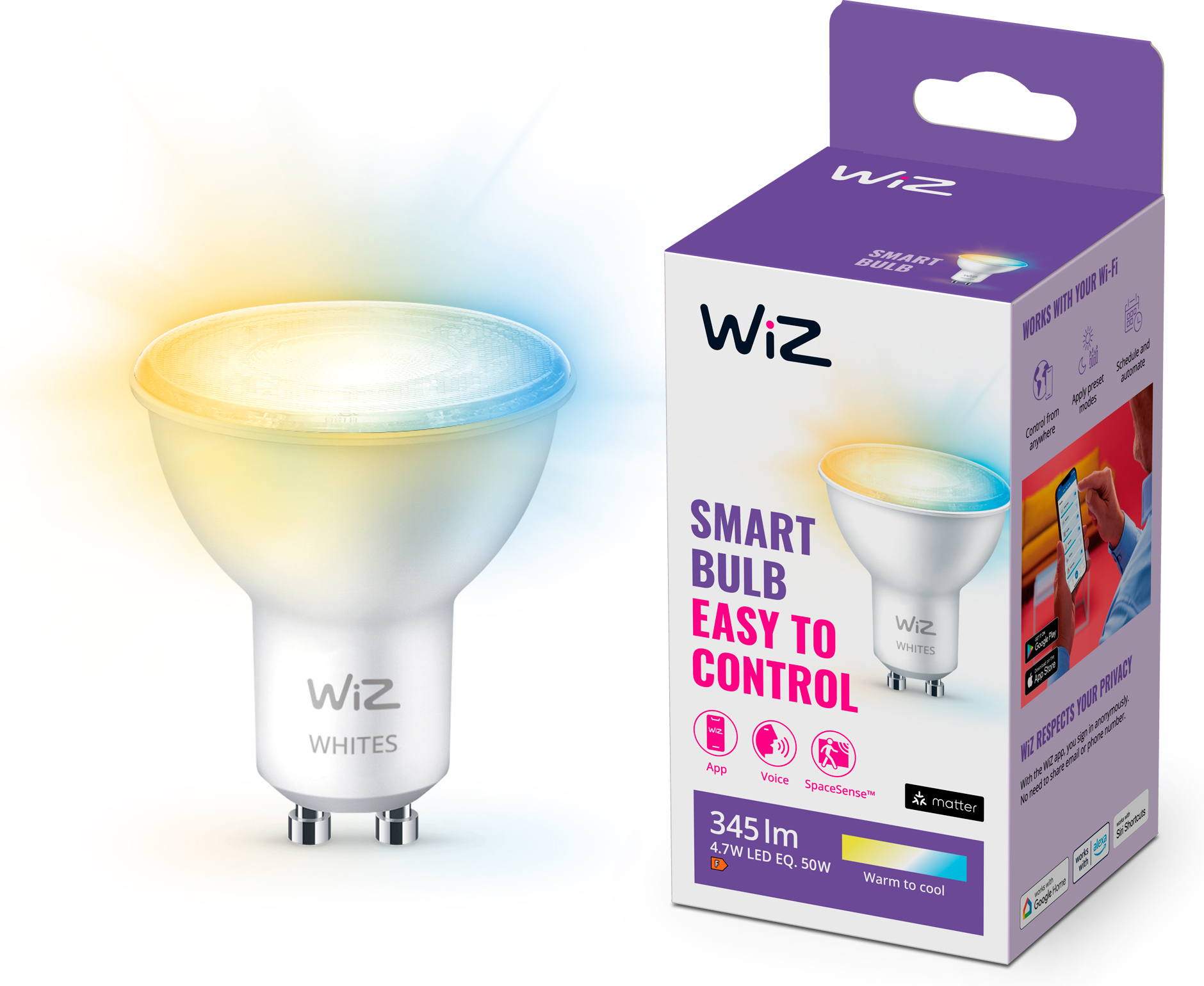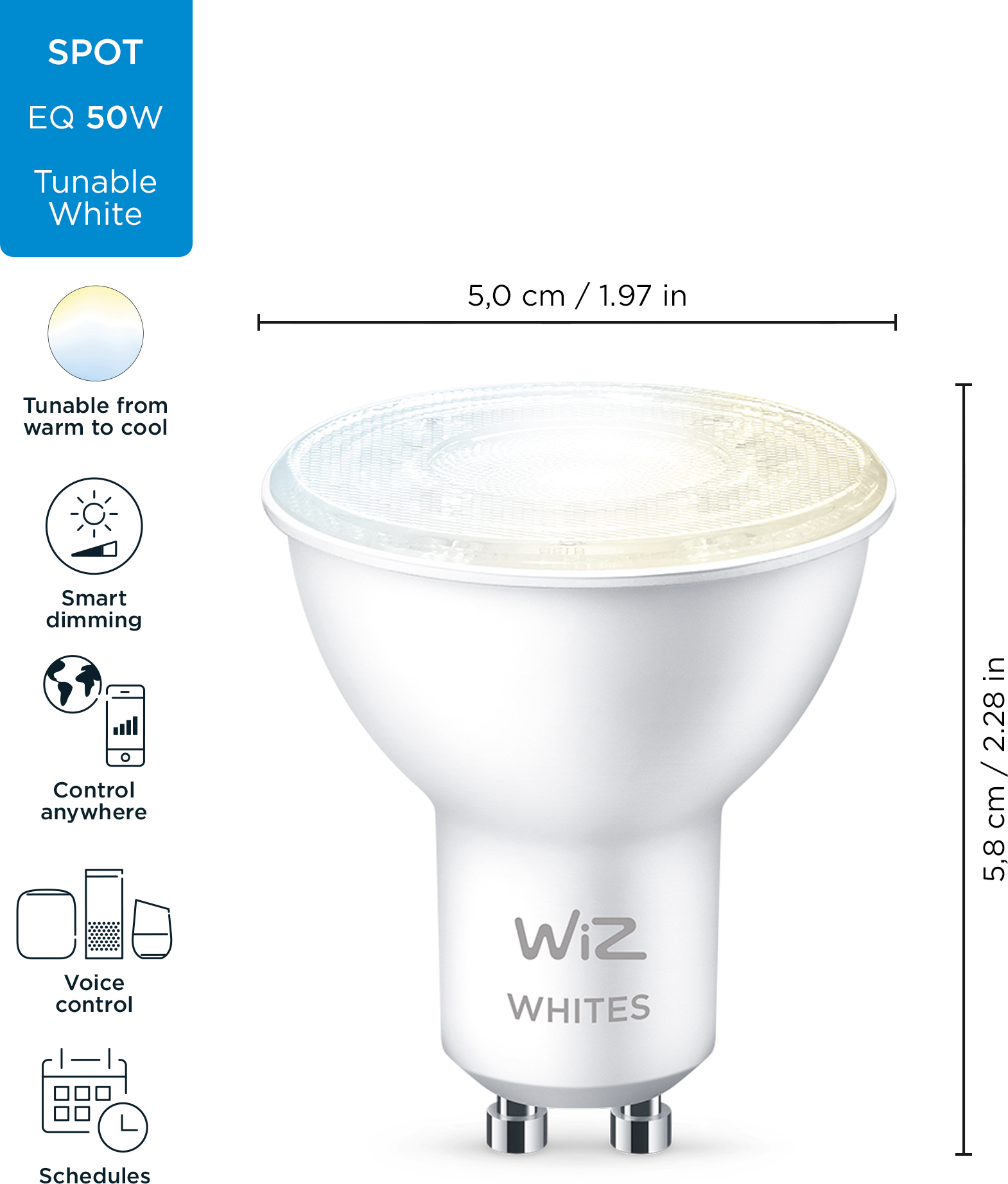 WiZ LED-lambi abil saate oma ellu tuua inimkesksed ja teie igapäevase rütmiga kohanduvad valgustoonid. See GU10-põhine prožektor võimaldab teil kasutada erinevaid valge valguse toone soojast külma valge ja päevavalguse toonideni.