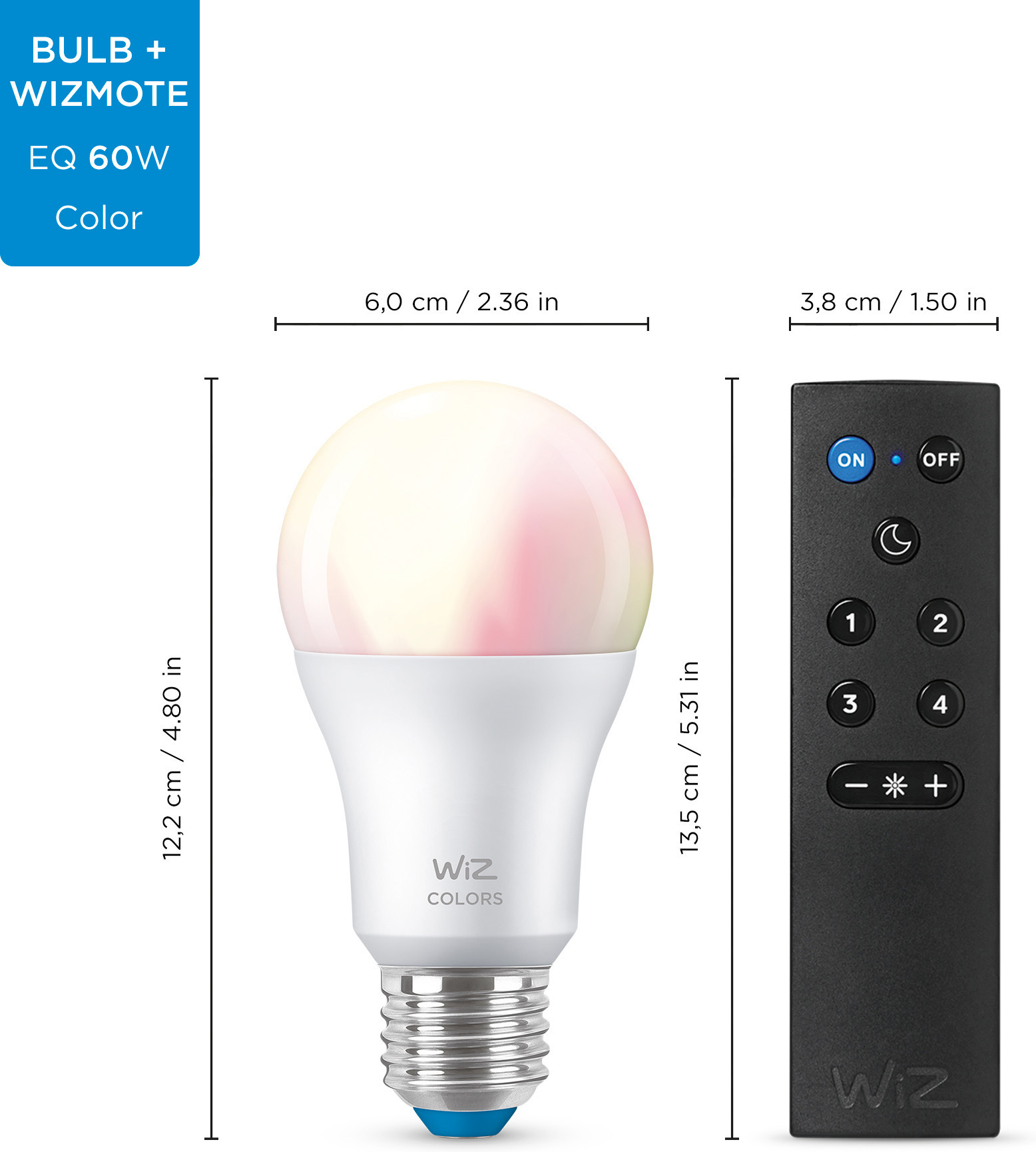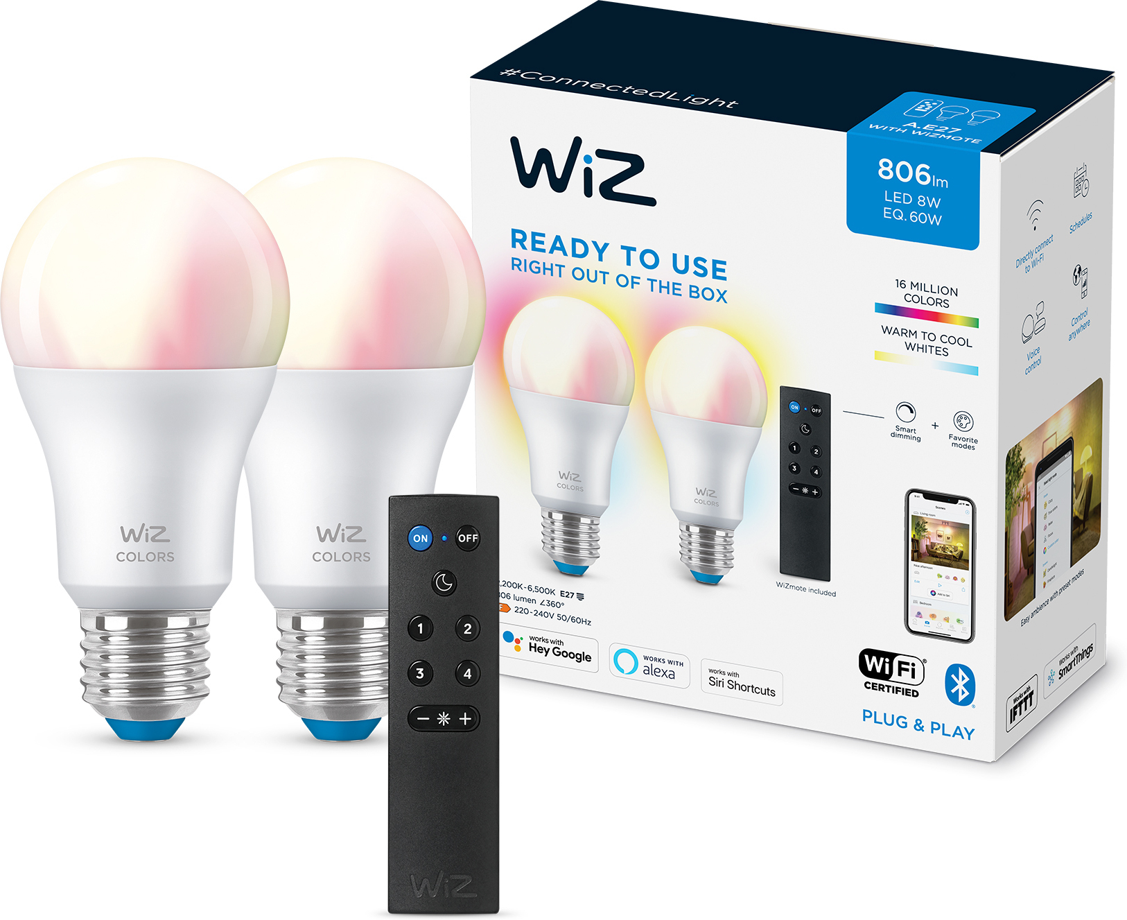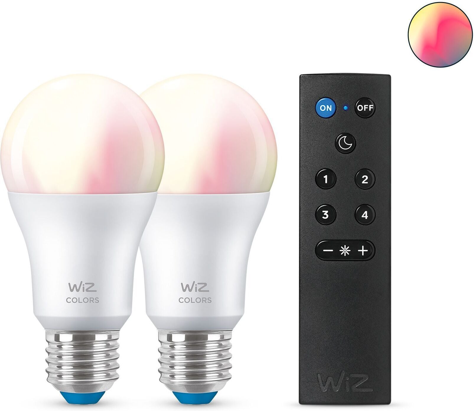 WiZ nutikas pirn, E27, RGBW – kõik värvid ja valged valgusvarjud, Wi-Fi, 806 lm, 2 tk komplektis WiZ puldiga