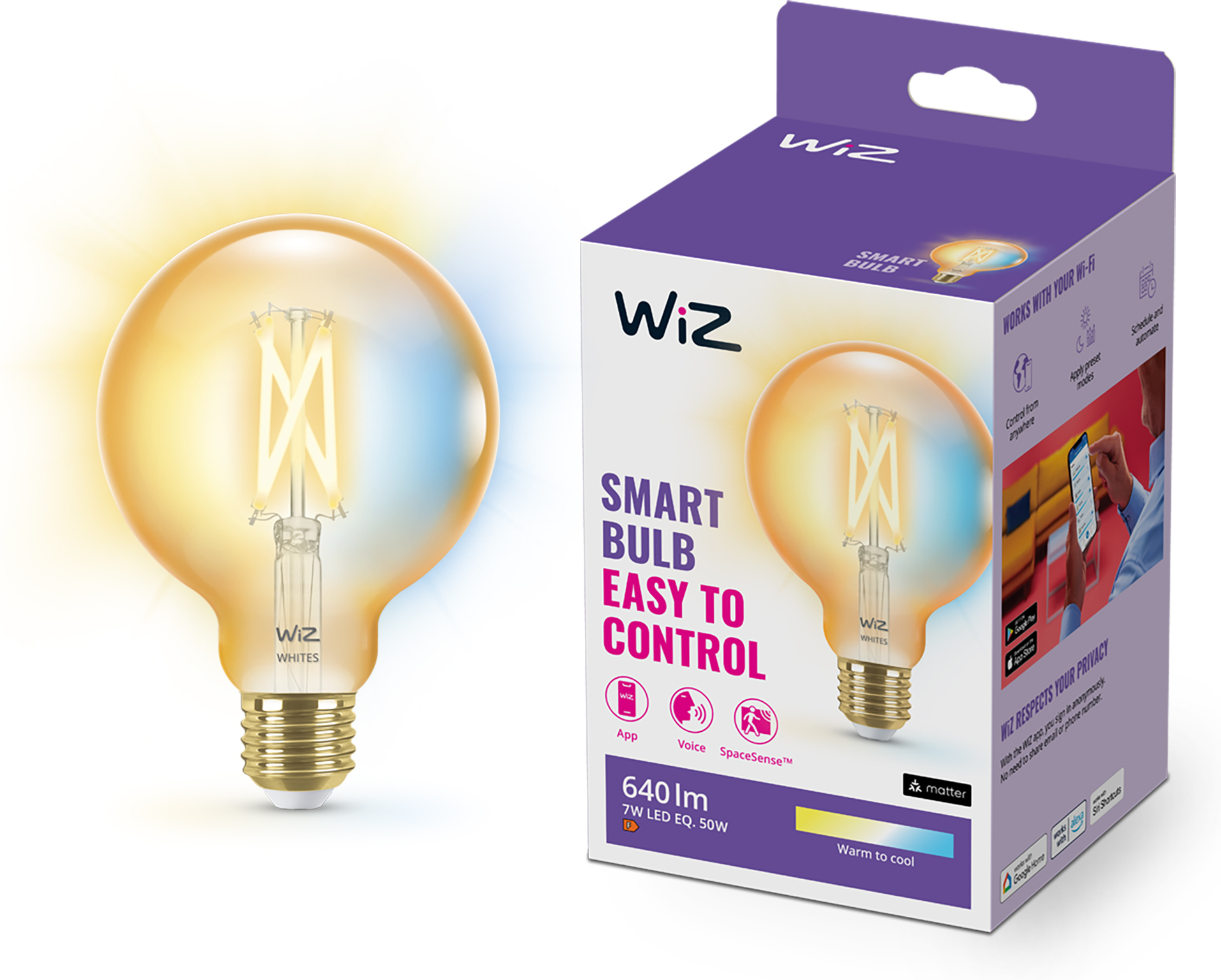 WiZ nutikas pirn, ümmargune, E27, merevaigukollane klaas, reguleeritav valge - valged valgusvarjud, Wi-Fi, 2000-5000 K, 640 lm, 9 cmWiZ nutikas pirn, ümmargune, E27, merevaigukollane klaas, reguleeritav valge – valged valgusvarjud, Wi-Fi, 2000-5000 K, 640 lm, 9 cm