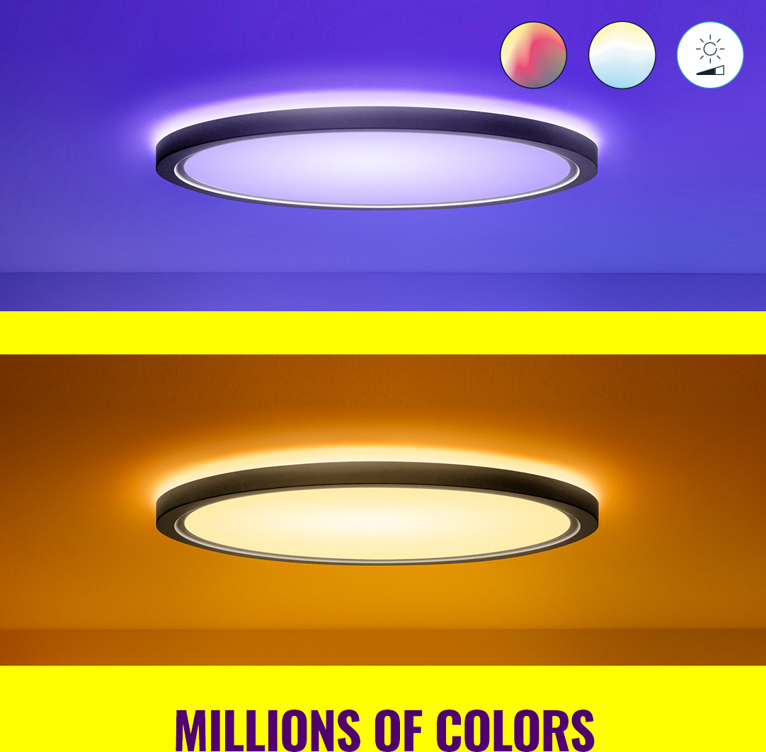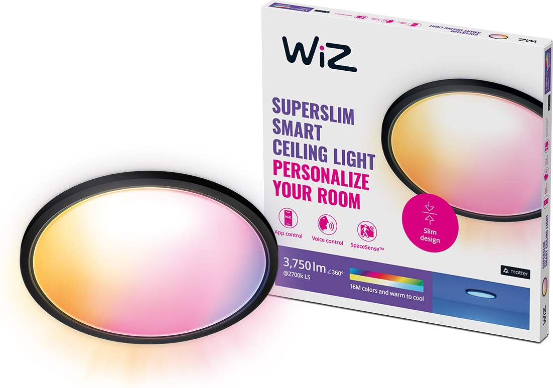WiZ Superslim -kattovalaisimella tuot kotiisi paljon valoa missä tahansa värissä ja sävyssä. Valaisimen minimalistinen muotoilu, ohut rakenne sekä musta väri sopivat jokaiseen kotiin. Luot helposti persoonnallisen tunnelman mihin tahansa huoneeseen miljoonilla väreillä ja valkoisen valon lämpimän ja kylmän sävyillä. Leiki suosikkiväreilläsi ja käytä kirkkaan päivänvalon kylmiä sävyjä lisätäksesi energiaasi ja keskittyäksesi. Säädä valkoisen valon lämpimiä sävyjä luodaksesi kodikas tunnelman, joka auttaa rentoutumaan. Älykkään himmennyksen ja valmiiksi asetettujen valaistusasetusten avulla luot hetkessä täydellisen tunnelman.