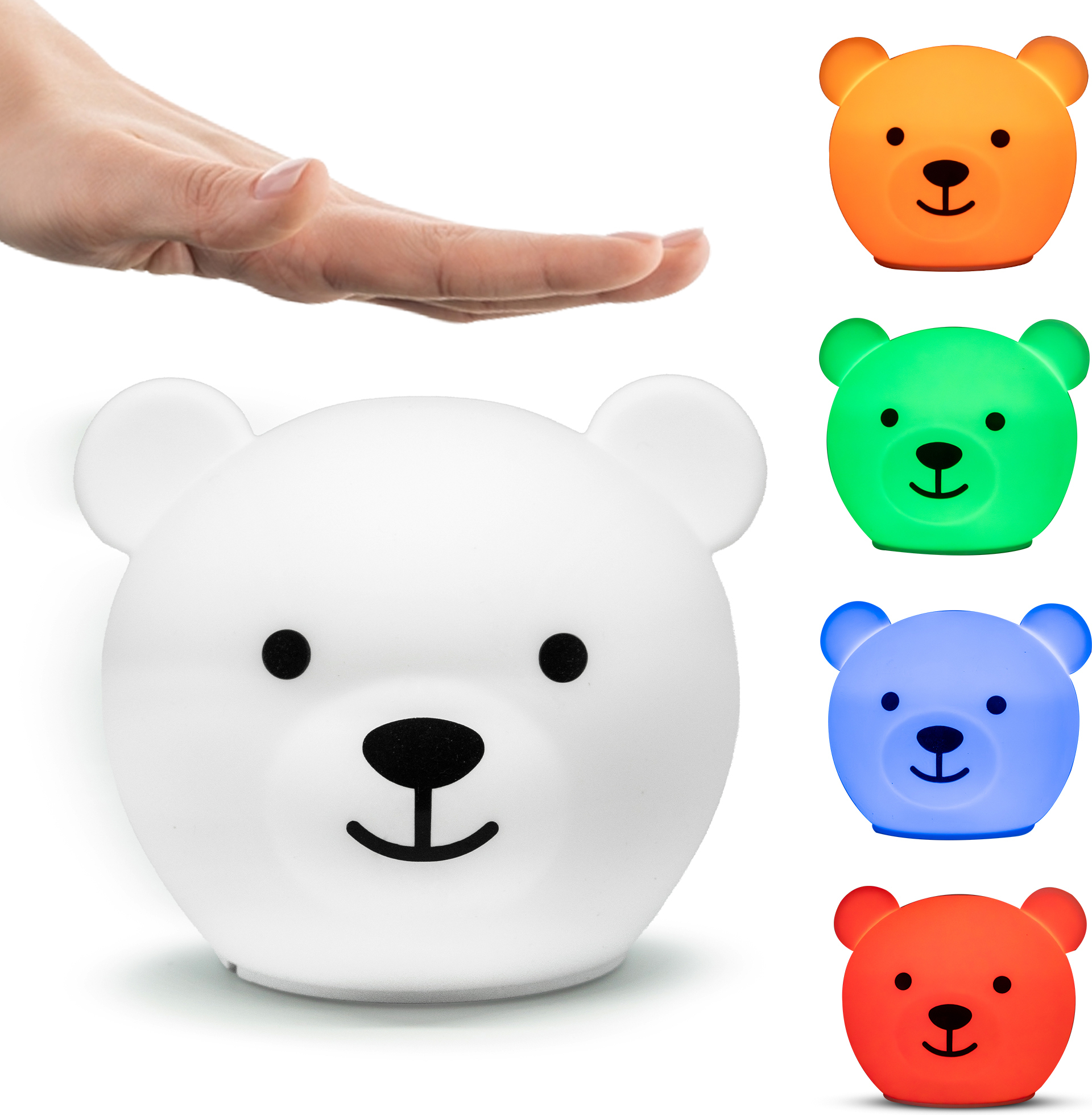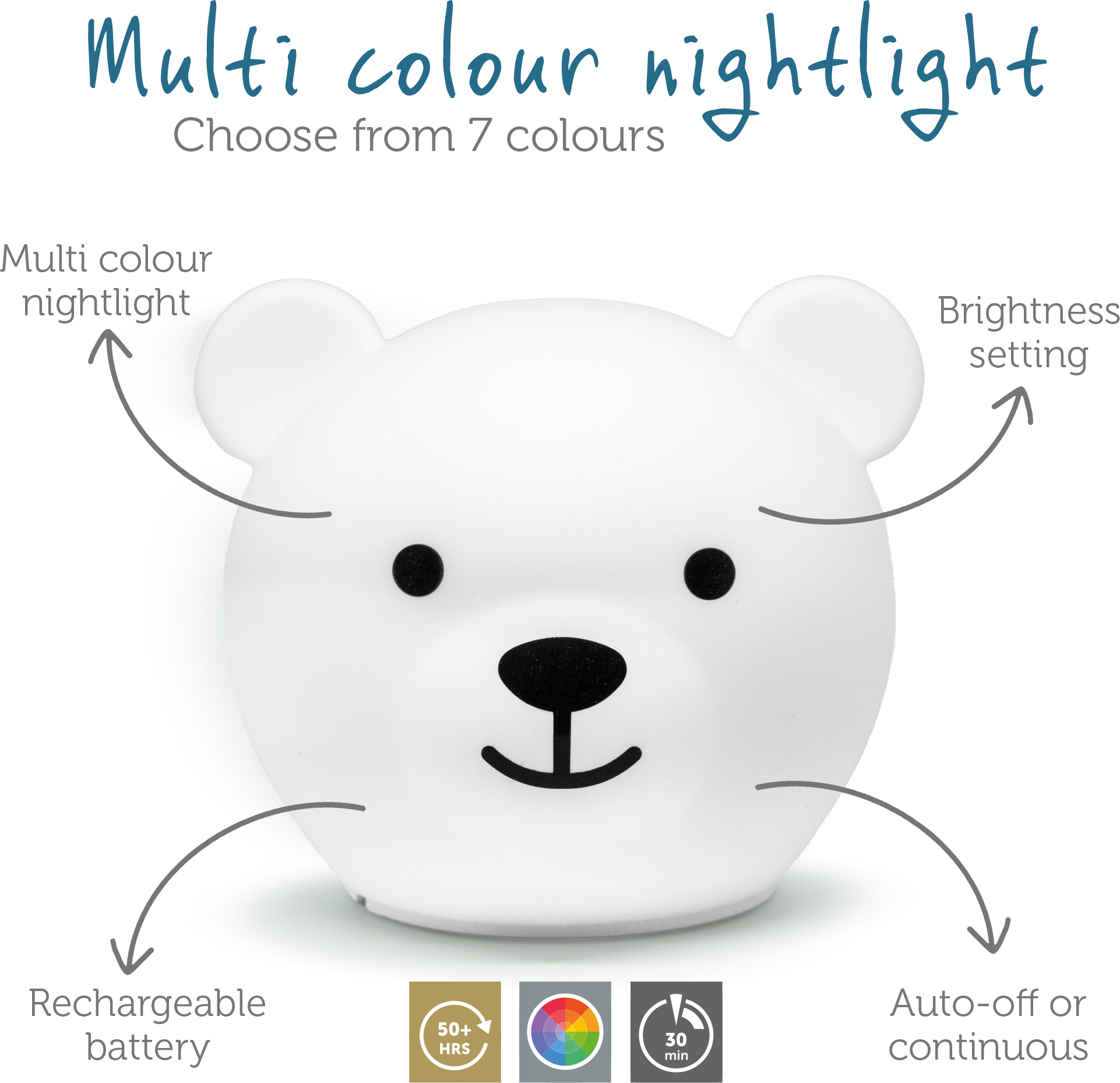 Bor Bear on armas pehme pinnaga öölamp kaheksa värvi ja kolme heleduse seadistusega. See laetav valguskaaslane pakub ühe laadimisega kuni 50 tundi valgust ja sobib ideaalselt lastetoas meeleolu loomiseks!